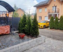 Возле дома участок земли, на котором оборудована мангальная зона, посажены цветы, а также есть возможность для парковки автомобиля.