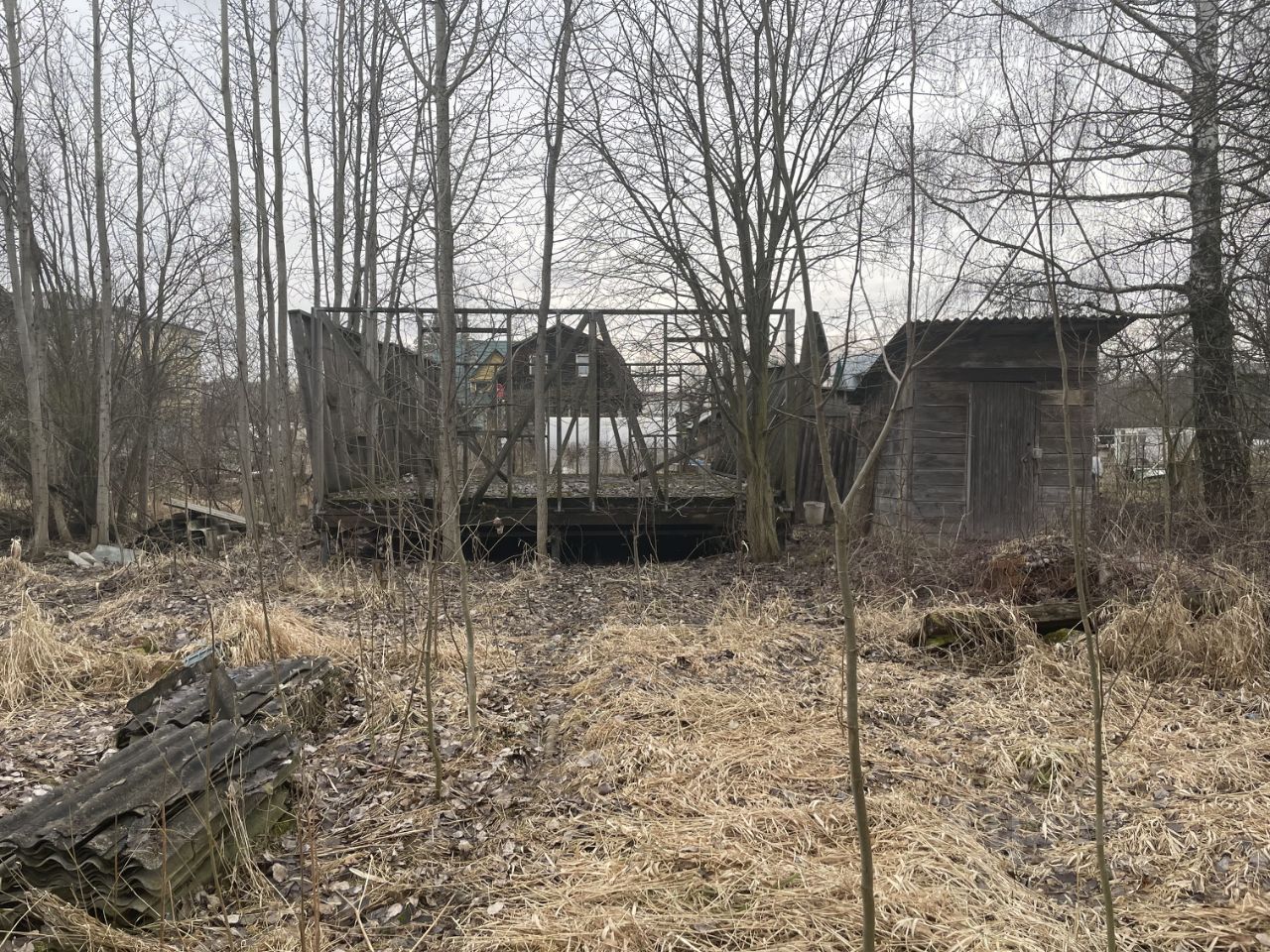 На участке есть ветхий после пожара жилой дом ( под снос), рядом участок с пожарным водоемом.Выезд с участка на асфальтированную дорогу. Рядом и напротив прекрасные дружелюбные соседи. Место расположения тихое и спокойное.