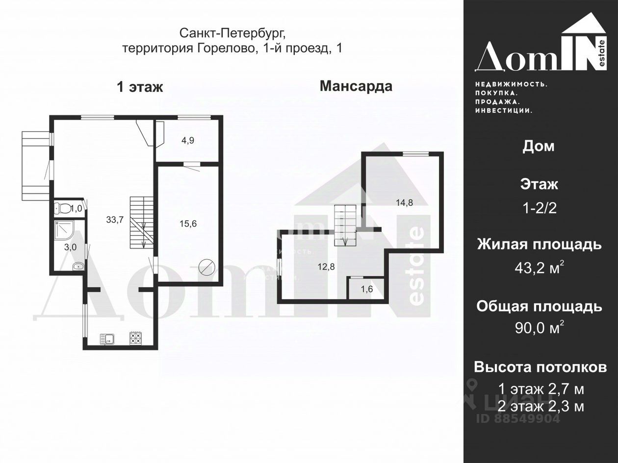 Состоит из 2-x этaжeй (мансарда), плoщадь 90 кв.м., 3 комнаты, два санузла на 1-м и 2-м этажах.
