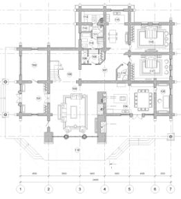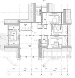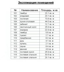 В планировке предусмотрены: гостиная со вторым светом и камином, кухня-столовая с печью, зона барбекю на террасе, 6 спален, кабинет, гостевая кухня, помещения под кладовую, гардеробные.