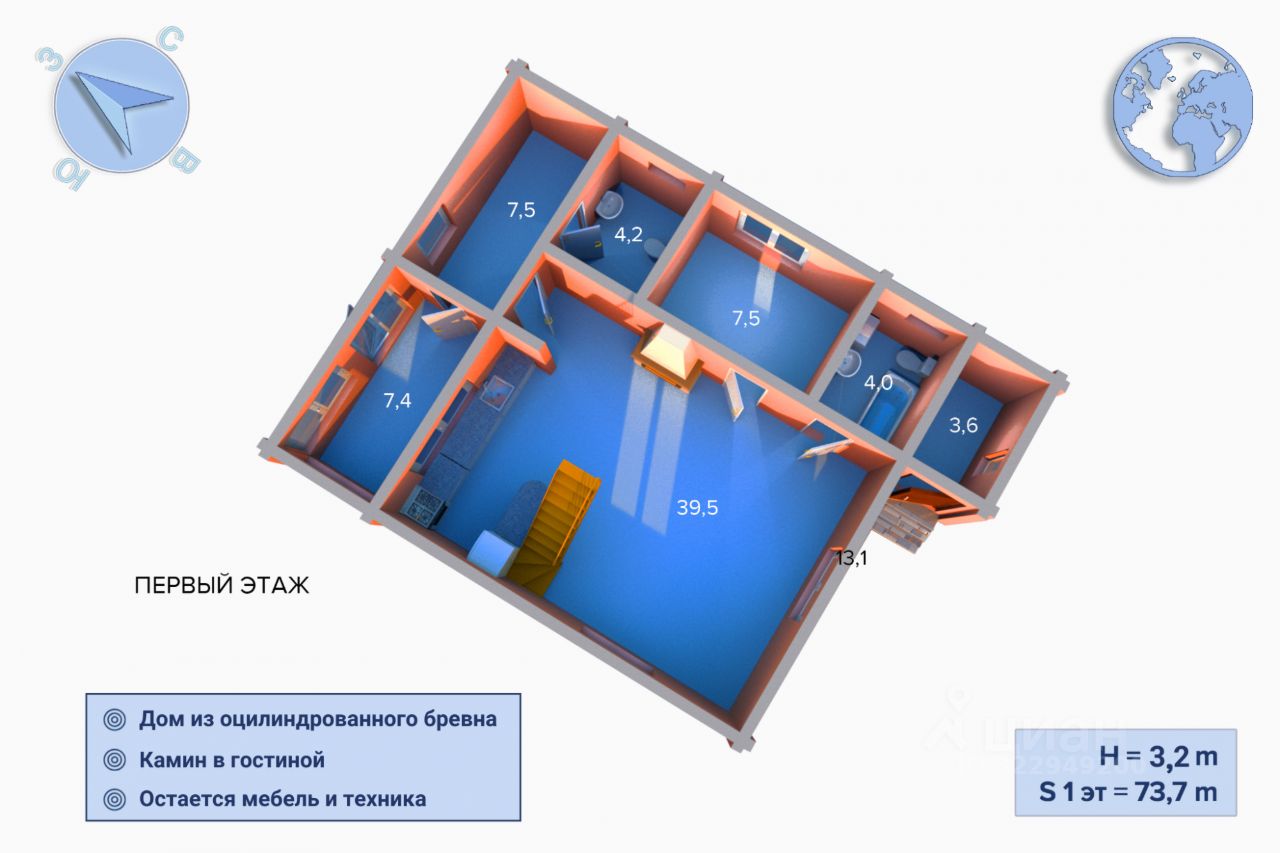 Площадь дома — 123,2 м². Построен в 2019 году из оцилиндрованного бревна диаметром 21 см — прочного материала, который обеспечивает тепло зимой и прохладу летом.