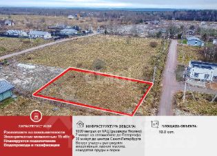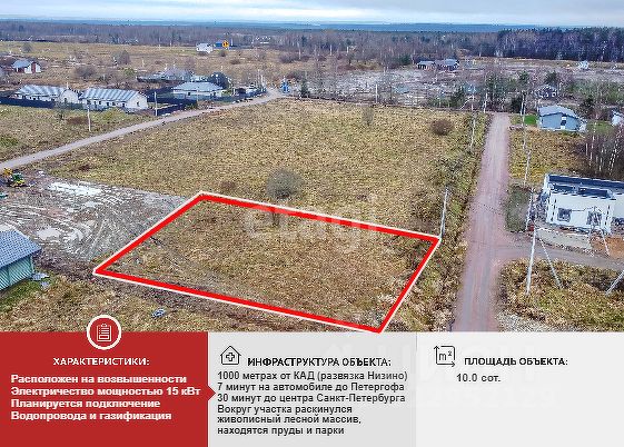 Продается уникальный участок площадью 10 соток, идеально подходящий для строительства вашего загородного дома вблизи от г. Санкт - Петербурга. Вид разрешенного использования- для дачного строительства. Можно зарегистрировать в доме. Участок расположен на возвышенности, что гарантирует отсутствие подмываний и обеспечивает хорошие виды.