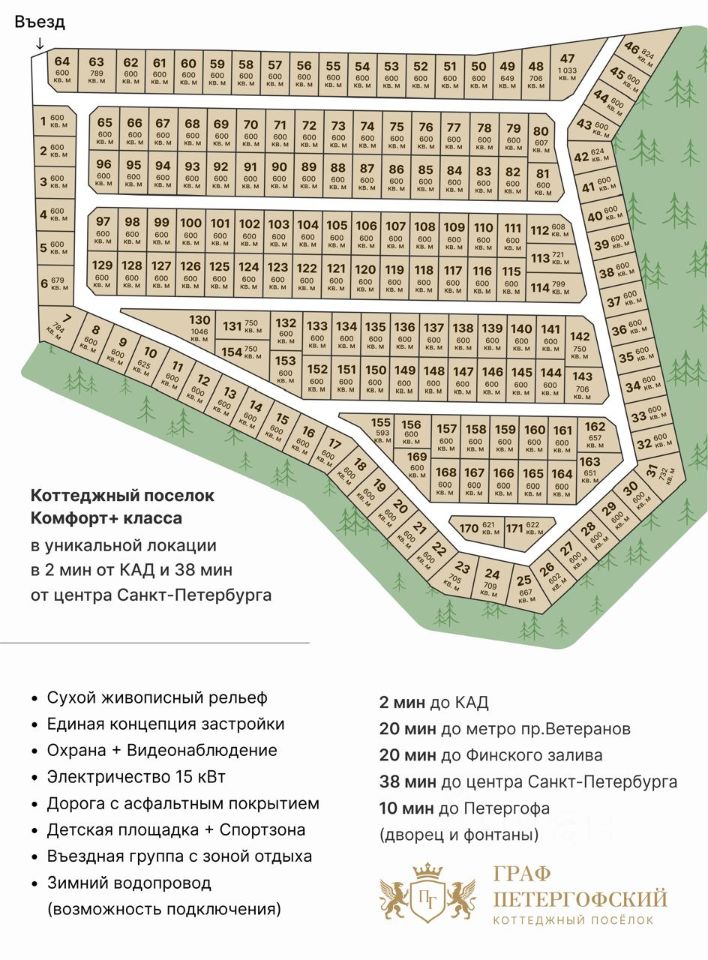 КП Граф Петергофский огражден по периметру, круглосуточно охраняется. Обеспечен комфортный подъезд круглый год благодаря дорогам с асфальтным покрытием. Поселок выбирают для удобной загородной жизни и отдыха в великолепной транспортной доступности от города.