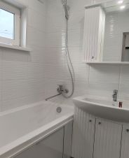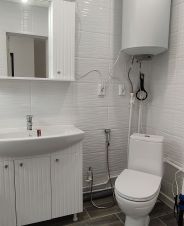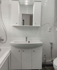 - В санузле 1 этажа разведена сантехника под ключ (ванна, унитаз, тумба с раковиной, подвесной шкаф, водонагреватель), сварены полипропиленовые трубы, теплый пол;