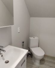 - В санузле 2 этажа разведена сантехника (унитаз, тумба с раковиной, подвесной шкаф);