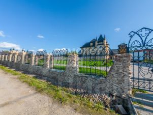 Забор из натурального камня с фигурной ковкой и большими автоматическими воротами.