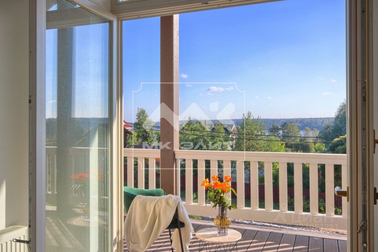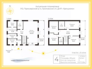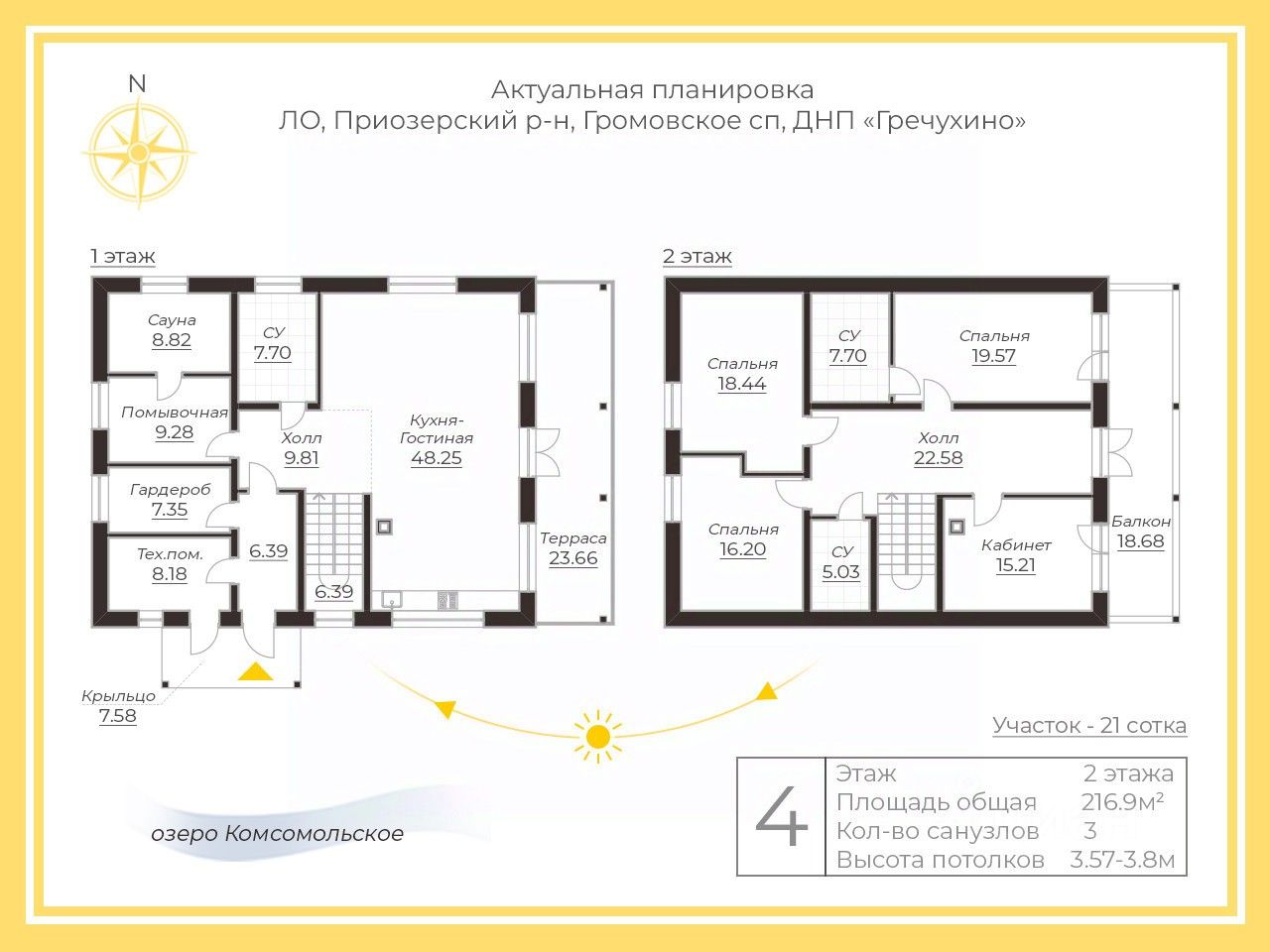 Планировка максимально эргономична: на 1 этаже просторная кухня-гостиная с выходом на террасу, а также хозяйственные и технические помещения, санузел с сауной. На 2 этаже: 4 изолированные комнаты, 1 из которых мастер-спальня. С балкона открывается вид на озеро.