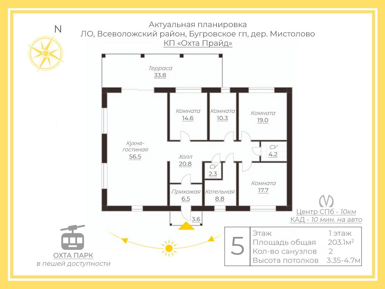 Арт. 77571988 Представляю вашему вниманию Коттедж с террасой на участке площадью 12,3 соток в новом элитном посёлке закрытого типа "OХТА ПРАЙД", который граничит с одним из лучших курортов Санкт-Петербурга и Ленинградской области ОХТА ПАРК. "OХТА ПРАЙД" это уникальный загородный проект бизнес-класса, расположенный всего в 10 километрах к северу от Санкт-Петербурга, в пешей доступности от престижного курорта Oхта Парк. Здесь продумана каждая деталь для активного и комфортного отдыха: оборудованные горнолыжные трассы и подъемники, маршруты для беговых лыж, просторный каток, уютные кафе и стильные рестораны. Важно, что коттеджный посёлок находится в стороне от трассы, в окружении хвойного леса, что помогает сохранить тишину и чистый свежий воздух. В планах застройщика строительство современного СПА-комплекса и тренажерного зала, что добавляет проекту привлекательности. Жителей поселка будет радовать близость школ, детских садов и магазинов. Все сервисы доставки еды активно обслуживают посёлок "ОХТА ПРАЙД". В доме удобная smart-планировка по всем современным канонам. В коттедж мы можем войти либо через большую крытую террасу в 33.8м², либо через главных вход с аккуратным крыльцом 3.6м². Далее проходим в прихожую 6.5 м² из него мы попадем в большой холл 20.8 м², благодаря которому у нас все комнаты изолированные. В левой части дома у нас располагается большая кухня-гостиная 56.5м² с выходом на террасу, с окнами во все стороны и самое главное высокими потолками в 4,7 метра и большими окнами, которые наполняют пространство светом и воздухом, создавая ощущение безграничной свободы. В правой части у нас располагаются 4 больший комнаты с площадями: 14.6 м², 10.3 м², 19 м² и 17.7 м². Также в доме 2 сан. узла и котельная. С одной стороны дома открывается захватывающий вид сосновый бор. Тонкие лучи солнца, пробиваясь сквозь кроны, создают завораживающую игру света и тени, даря ощущение спокойствия и уединения. Этот зеленый массив словно приглашает вдохнуть аромат хвои и насладиться умиротворением лесной прохлады. С другой стороны дома открывае потрясающий вид на живописные просторы Охта-парка. В любое время суток этот уголок природы восхищает своей красотой, но особенно впечатляет вечером, когда мерцающая подсветка превращает его в сказочный пейзаж. Свет, рассыпаясь по волнистым холмам и склонам, подчеркивает каждый изгиб рельефа, напоминающего суровую и романтичную Карелию. Тени от сосен и кустарников ложатся на ландшафт, создавая причудливые узоры, которые завораживают взгляд. Эти пейзажи — не просто часть окружающего мира, а важная составляющая жизни в этом доме. Они дарят покой и вдохновение, превращая каждый день в нескончаемую прогулку по галерее природных картин. Живя здесь, вы будете наслаждаться утренним кофе под мягкие лучи восходящего солнца и вечерними созерцаниями огней, рассыпанных по ночному парку. Этот дом с его просторными окнами и террасой — настоящее воплощение мечты для тех, кто стремится к единению с природой, не жертвуя при этом комфортом и уютом современной жизни. При постройке дома использовались только качественные материалы стены построены из сверхпрочного керамического блока Porotherm и облицованы кирпичом Terсa. Толщина наружных стен составляет 440 мм + 70 мм, что обеспечивает отличную тепло- и шумоизоляцию. Территория "ОХТА ПРАЙД" надежно