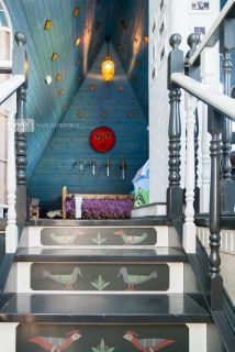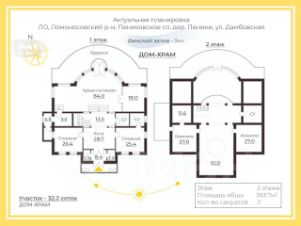 Дом-Храм с уникальной архитектурой в форме креста: южный фасад — это классическая русская усадьба из светлого камня с бельведером и светящейся скульптурой Ноя; Северный фасад, обращенный к воде, в своих формах повторяет русскую усадьбу, но выполнен с панорамным остеклением двусветного зала, открывающим невероятный вид на акваторию Финского залива. Перед северным фасадом высажен фруктовый сад. Южный фасад Дома-Храма охраняют скульптуры львов, перед ними установлен памятник Трезини. Это дом, где вы выбираете настроение каждый день. Площадь Дома-Храма 383 метра и включает в себя 2 этажа, спальни, гостиные зоны.