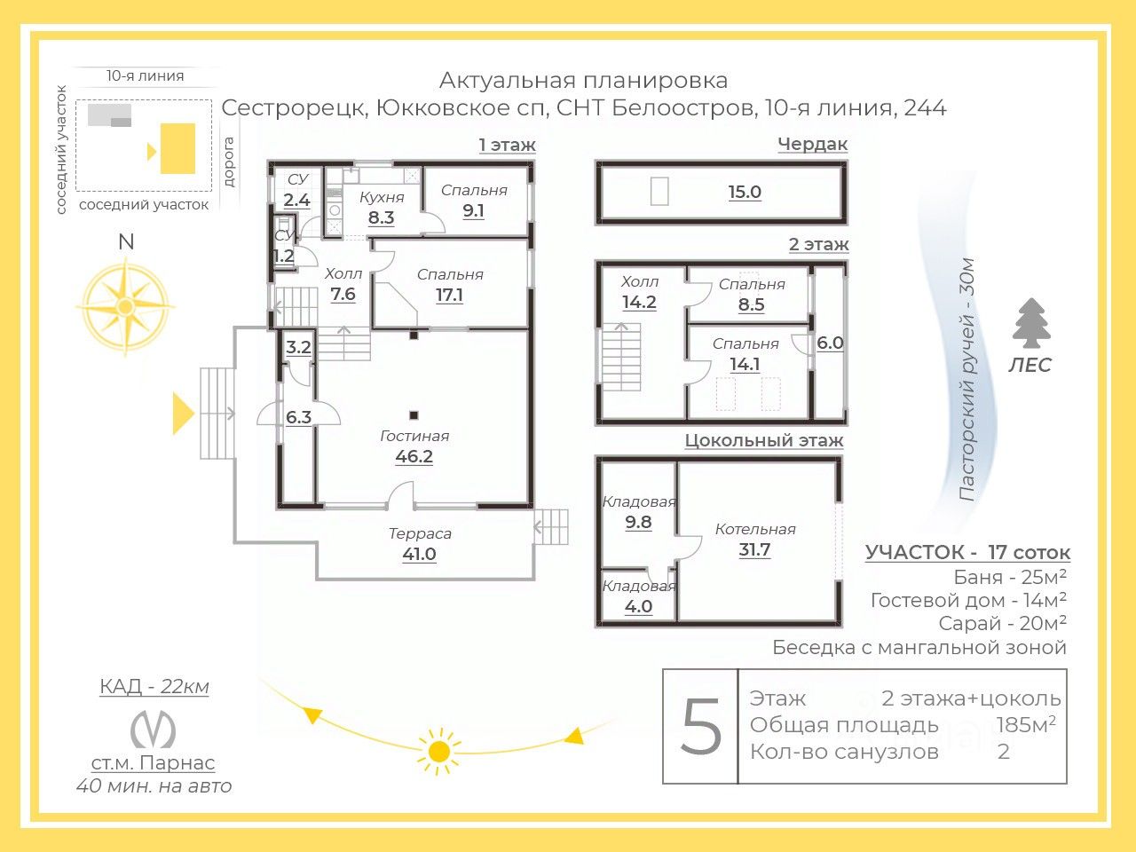 Участок расположен в 30 метрах от ручья Пастерского и лесного массива, богатого грибами и ягодами. Территория пригодна для велосипедных прогулок и лыжных пробежек в зимний период.