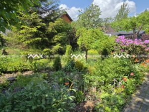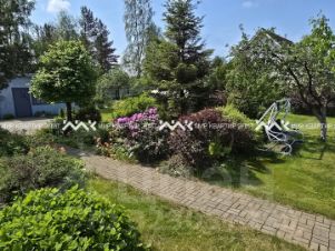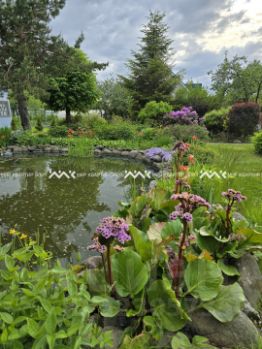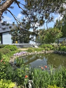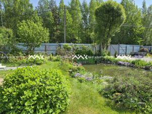 На участке выполнены работы по ландшафтному дизайну, включающие обустройство вместительной парковки, создание декоративного пруда с лилиями и рыбами, монтаж дренажной системы, посадку декоративных и плодовых растений, устройство газонного покрытия и обустройство детской игровой площадки с песочницей.