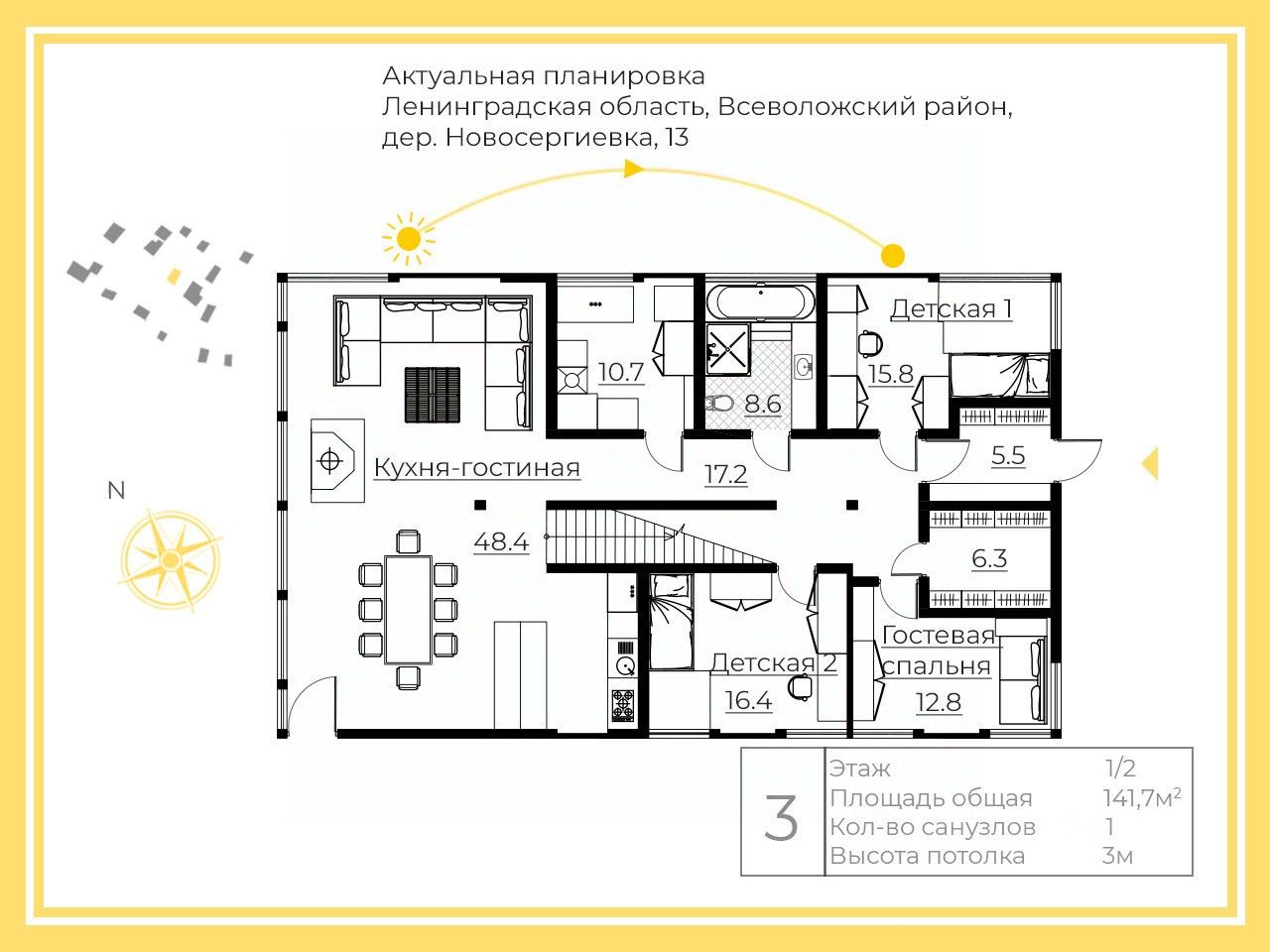Первый этаж 150 кв.м: кухня-гостиная 56 кв.м со вторым светом и высотой потолка 7 м, три жилые комнаты 16, 16 и 12 кв.м, ванная комната с панорамным остеклением, гардеробная, входная зона, котельная.