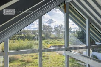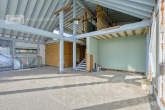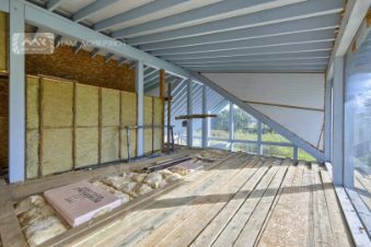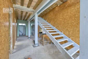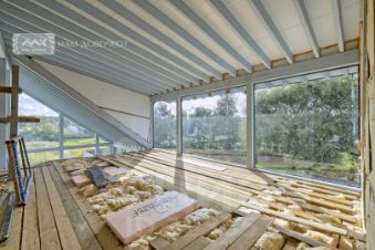 Дом возведен по технологии финский фахверк (есть ещё немецкие фахверки, отличие в технологии монтажа стеклопакетов) на фундаменте (плита) с усиливающими тумбами по углам периметра и в середине главного фасада. Подходит для круглогодичного постоянного проживания, готов к прокладке инженерных коммуникаций и внутренним отделочным работам. Возможны любые варианты планировки и перенос ненесущих конструкций и перегородок.