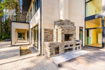 На первом этаже находится: большая кухня-гостиная, прихожая, холл, гардероб, сан-узел, кладовая, подсобное помещение, техническое помещение, гараж, спорт-зал, терраса для летней кухни с печью.
