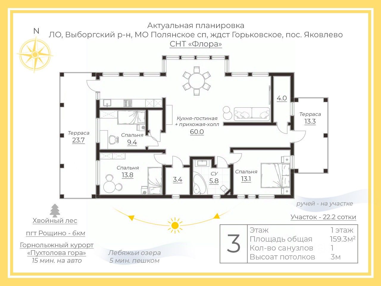 Площадь дома - 159,3 кв.м.. Участок- 22,2 c. в собственности.