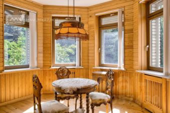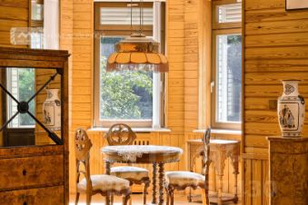 Первый этаж является гостевой зоной и местом сбора семьи: здесь гостинная (50м2), столовая (43,5 м2) и кухня (15м2). Отдельная комната с эркером использовалась ранее как бильярдная (36 м2) - ее размеры позволят ее использовать под любые цели.