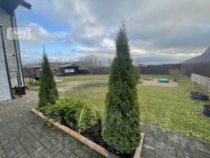 Ухоженный участок, на котором высажены плодовые деревья, хвойные растения, цветы. Большую часть участка занимает газон. Есть крытая теплица.