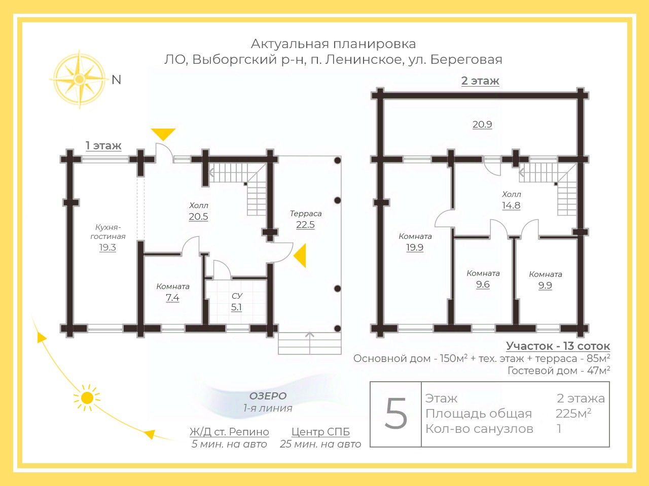Площадь: 225 кв.м жилая площадь и 85 кв.м технический этаж и терраса.