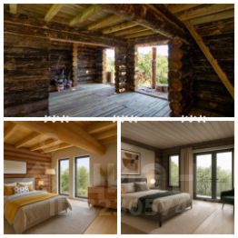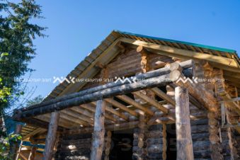 Основной дом из бревна. Построен в 2025г и возведен под крышу. Все коммуникации заведены в дом (газ, вода - скважина, канализация)
