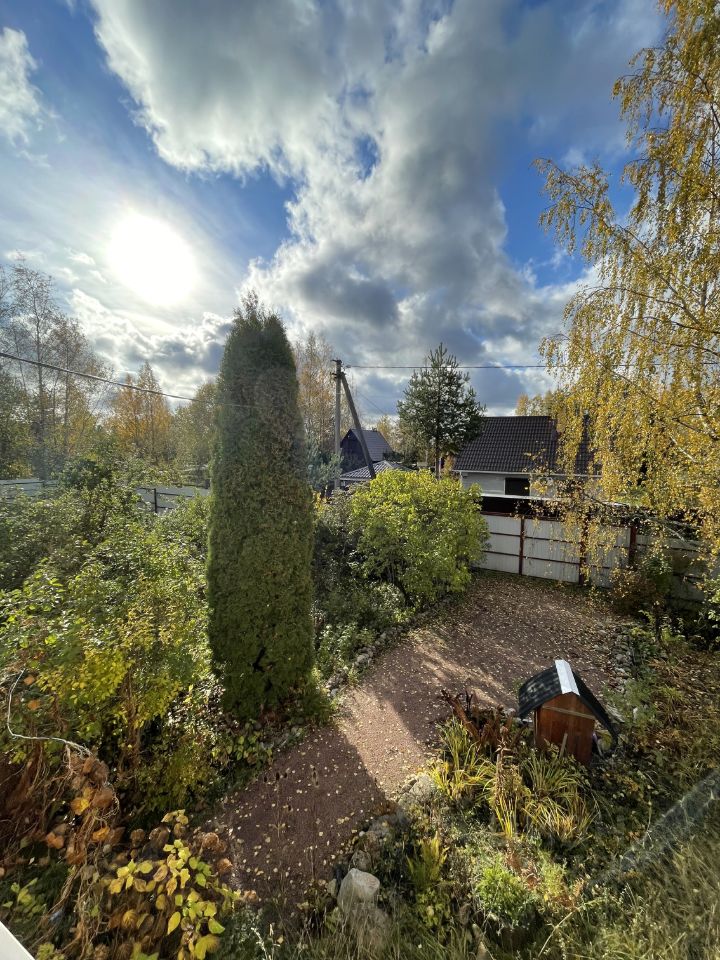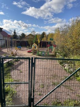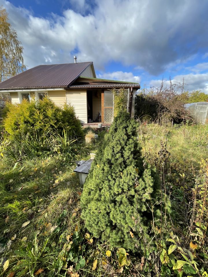 Участок полностью разработан, огорожен металлическим забором. Сделан новый заезд на участок. Есть большой парник, высажены плодовые деревья (яблоня, вишни, сливы), кусты (малина, жимолость, крыжовник, смородина, барбарис). Множество разных хвойников, альпийская горка, клумбы, грядки с клубникой.