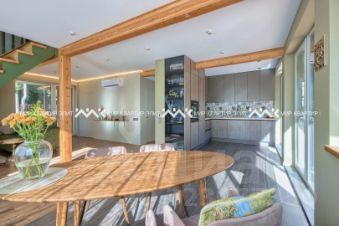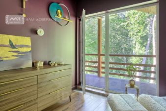 В доме продуманная эргономичная планировка, установлены окна в пол. Когда находишься в зоне кухни-гостинной, открывается полный обзор на лес.