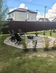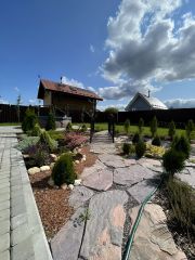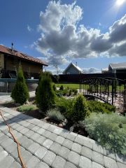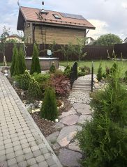 - ухоженный газон и облагороженные клумбы с плодовыми деревьями и ягодными кустами.