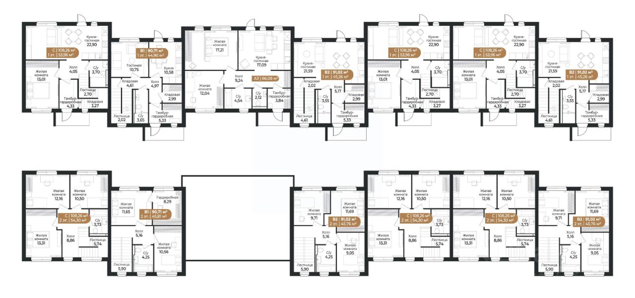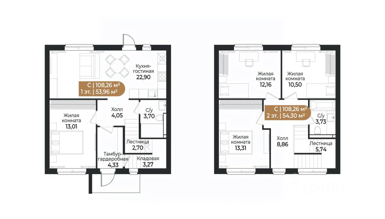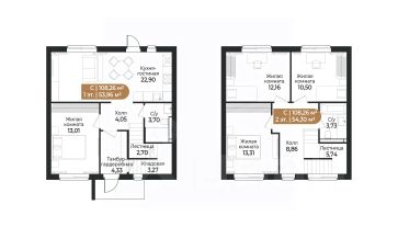 Двухэтажный таунхаус евро-планировки площадью 108.26 кв. м имеет четыре жилые комнаты (10.50, 12.16, 13.01 и 13.31 кв. м), просторную кухню-гостиную (22.90 кв. м), маленькую кладовую и два санузла. Во входной зоне предусмотрено место под небольшую гардеробную зону.