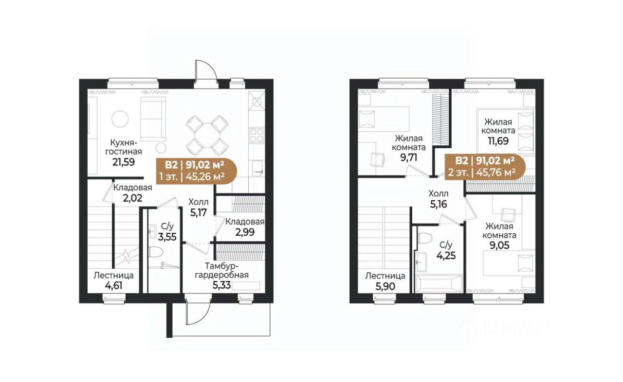 Двухэтажный таунхаус евро-планировки площадью 91.02 кв. м имеет три небольшие жилые комнаты (9.05, 9.71 и 11.69 кв. м), просторную кухню-гостиную (21.59 кв. м), две кладовые и два санузла. Во входной зоне предусмотрено место под гардеробную. Перед входом в дом есть 2 парковочных места, а на заднем дворе собственное патио площадью 75.2-309.2 кв. м, где можно организовать площадку для отдыха или барбекю. Внутренняя отделка Таунхаус сдается с полной чистовой отделкой и готовой кухней. В основе дизайн-концепции лежат идеи скандинавского минимализма. Светлые природные оттенки подойдут для воплощения большинства интерьерных идей. В отделке использован износостойкий ламинат 32 класса с древесной фактурой, белые матовые флизелиновые обои под покраску, плинтуса в цвет стен, белые матовые натяжные потолки с креплением под люстру и встроенными спотами, межкомнатные двери из МДФ с черной фурнитурой. В санузлах крупная керамическая плитка с мраморным узором на стенах и серая на полу; унитаз с инсталляцией, белая раковина со смесителем, белая акриловая ванна с экраном. Предусмотрено место для подключения стиральной машины. Кухонный гарнитур спроектирован по индивидуальным параметрам. Корпус и нижний фасад светлого оттенка дуба, а верхний фасад белого цвета. Во внутреннем оснащении есть лоток для столовых приборов и двухуровневая сушилка для посуды. Кухня укомплектована встроенной техникой: 4-конфорочная электрическая варочная поверхность, электрический духовой шкаф, вытяжка, посудомоечная машина, встроенная композитная мойка и смеситель с аэратором. Внешняя отделка Фасад выполнен из трехслойных железобетонных стеновых панелей по монолитной технологии. Поверхность наружного слоя из архитектурного бетона имитирует текстуру и цвет деревянных реек и досок, а также кирпича. Расположение и инфраструктура Жилой комплекс "СветЛО" располагается в экологически чистом районе. Он окружен лесами, озерами и заповедниками. На закрытой охраняемой территории свой коммерческий кластер с пунктами выдачи, коворкингом, кафе и ресторанами, магазинами, фитнес-центром; променад длиной 1.5 км, пруд с набережной и пляжной зоной, сухой фонтан, уличные тренажеры, детские площадки, парк для выгула собак. Социальная инфраструктура включает детский сад на 140 мест и общественные прогулочные зоны японский сад и сад трав.