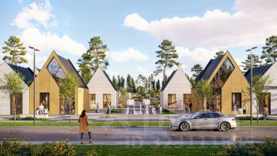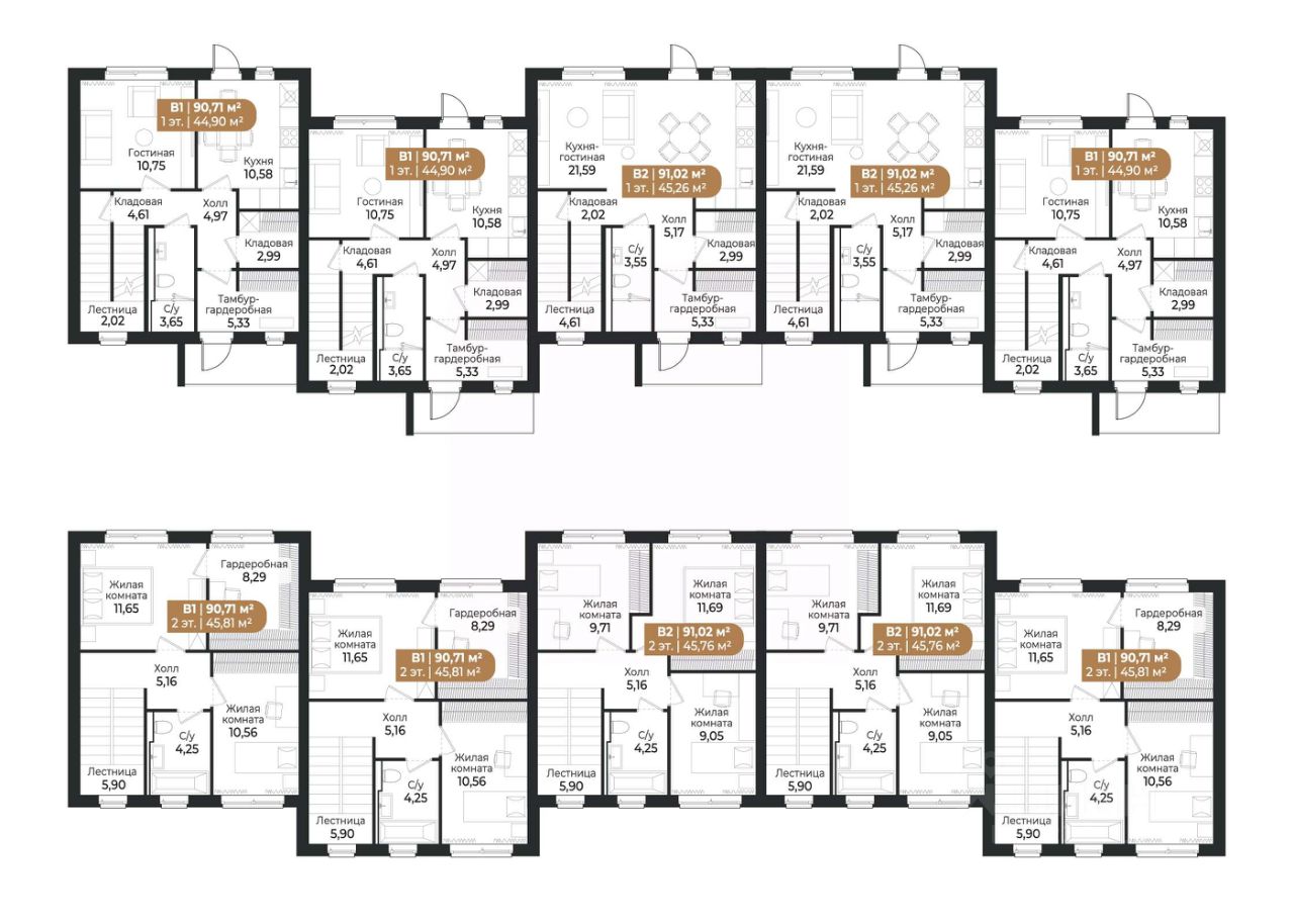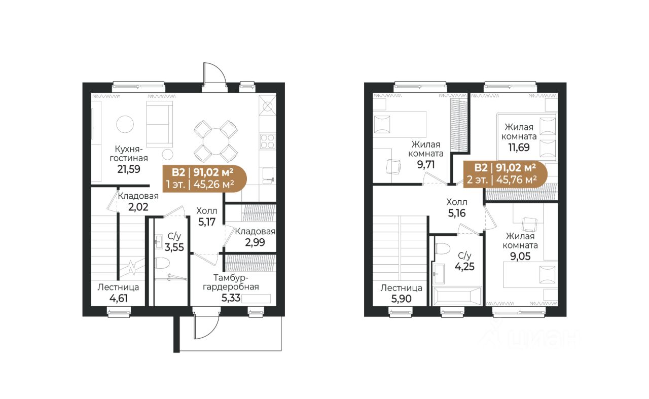 Двухэтажный таунхаус евро-планировки площадью 91.02 кв. м имеет три небольшие жилые комнаты (9.05, 9.71 и 11.69 кв. м), просторную кухню-гостиную (21.59 кв. м), две кладовые и два санузла. Во входной зоне предусмотрено место под гардеробную.