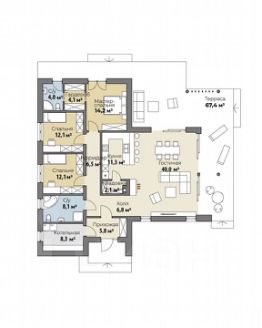 Кухня- гостиная 51,3 м2 с большими панорамными окнами и собственным выходом на террасу;
