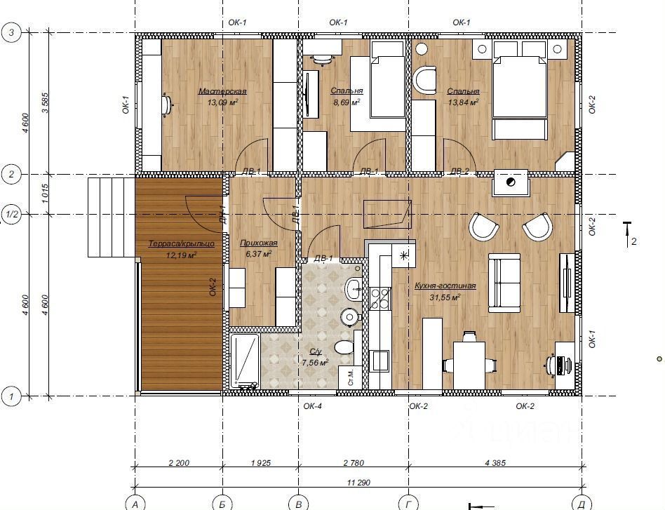3 спальные комнаты правильной формы 9, 13 и 14 м2;