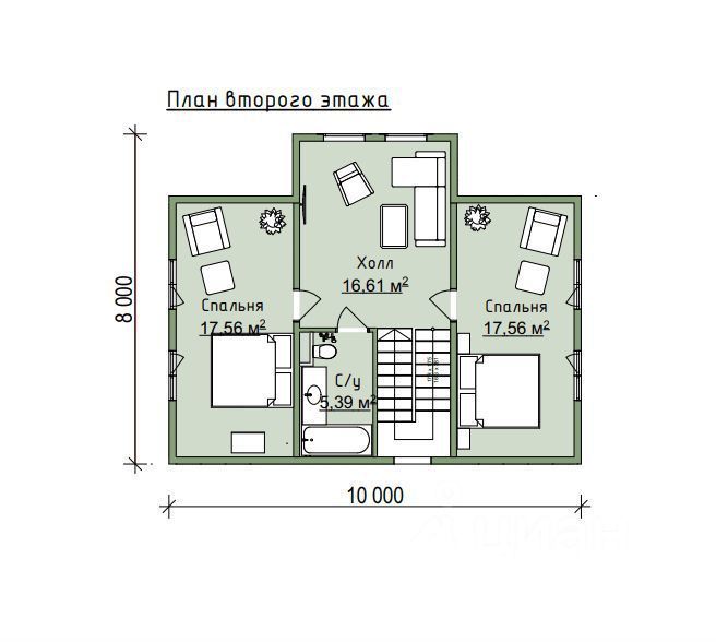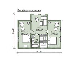 3 спальные комнаты правильной формы: одна 12,2 м2 на первом этаже и две по 17,6 м2 каждая на втором этаже;