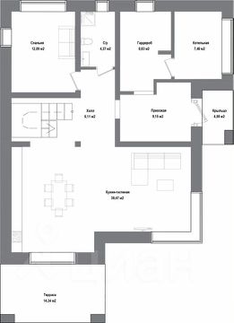 Кухня- гостиная 39,5 м2 с большими панорамными окнами и собственным выходом на террасу;