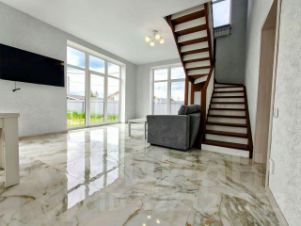 На первом этаже расположены просторная кухня-гостиная, большой сан/узел, гардеробная и техническое помещение с прачечной.