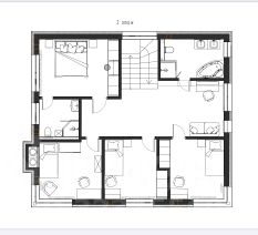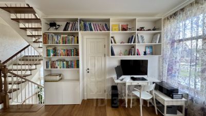 На втором этаже 4 спальни, две ванных комнаты, пространство холла с рабочим местом.