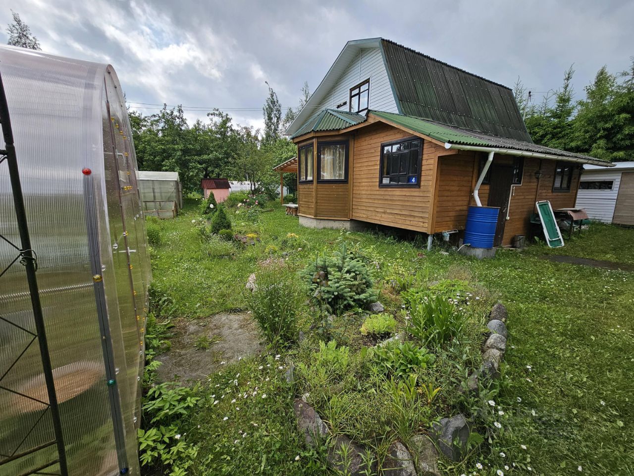 На просторном участке есть: уличный летний душ, небольшая банька-душевая (горячая вода подавалась от эл.бойлера), хоз.блок, детский домик, пара теплиц.