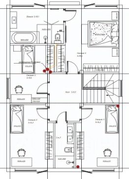 В доме свободная планировка, что дает возможность настроить конфигурацию помещений под индивидуальные потребности семьи. Внутреннее пространство позволяет с комфортом организовать до 5 спален.