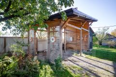 Навес для 2х машин, внутри установлен металлический контейнер, летний туалет.