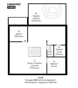 Площадь: 90,5 м2. (отапливаемая) + 49 м2. (балкон, терраса) = 139,5 м2.