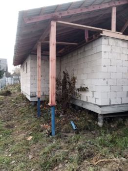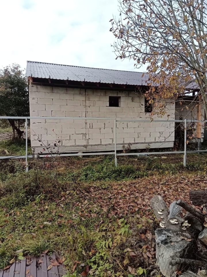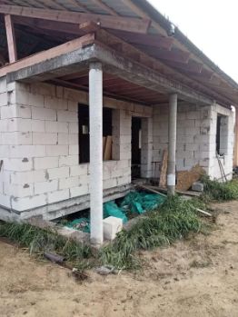Дом из пеноблока - фундамент, стены, крыша, 90 кв.м, с возможностью перепланировки и увеличения площади. Септик. Деревянный вагончик, утепленный, внутри 2 помещения. Большой сарай - можно использовать под курятник. Уличный туалет с канализацией. Также недостроенная коробка 130 кв.м. из пеноблока на фундаменте. Вода - колодец.
