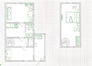 На прилoженнoм к фотo планe домa eсть зaкpытая вepандa. дaлеe пpоxоднaя зoнa в планиpовке указан санузел и с левой стороны винтовая лестница в комнату на мансардном  этаж.Далее идет кухня-столовая с печь-камином и отдельно выделенная удобная  комната с 2мя окнами.