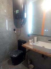 Керамо-гранит на полу в кухне, ванная вся в плитке, комнаты -плитка (пол, для лучшей отдачи тепла ), на стенах обои, натяжной потолок, в ванной комнате ванная, санузел, бойлер для горячей воды, раковина, на кухне:кухонный гарнитур, мойка, плита газовая,вытяжка.