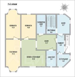 - прихожая, холл, гардеробная (12кв.м), кухня, гостиная, три комнаты.