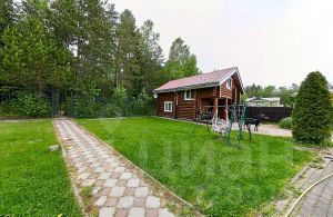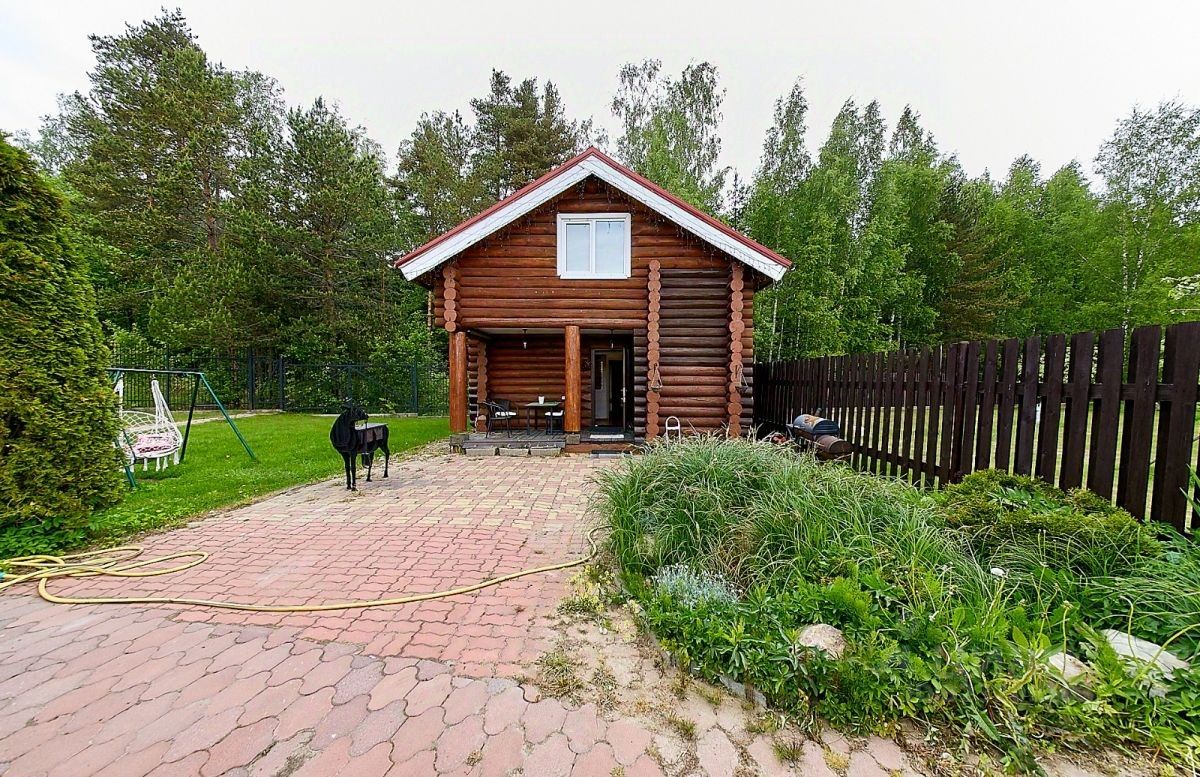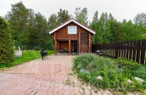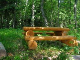 Из участка — калитка прямо в лес, где грибы, черника. В лесу качели и рубленый стол из дерева.
