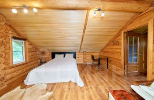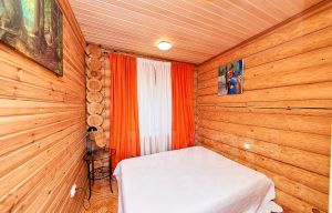 По скругленной лестнице мы попадаем на ВТОРОЙ ЭТАЖ. На втором этаже расположены еще две спальни, разделенные небольшой гардеробной зоной с комодом. Одна спальня может быть использована, как детская комната. Вторая-комната для семьи. В ней есть большая кровать, кровать для ребенка, диван и телевизор. Всего в доме 8 спальных мест.