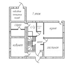На первом этаже - гостиная (изолированная), кухня с выходом в сад, рабочий кабинет.