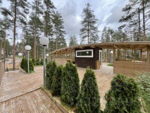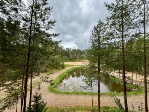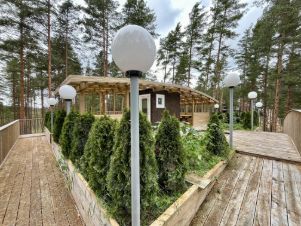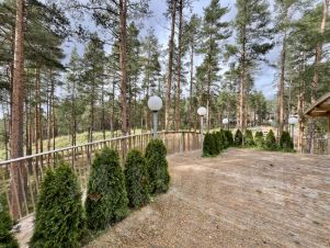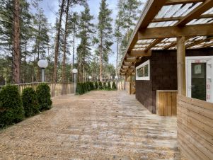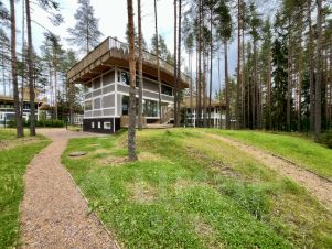 Дом расположен на возвышенности в окружении сосен, с крыши дома открывается прекрасный вид на кроны окружающих его деревьев.Участок примыкает к закрытому лесному массиву, что в некотором смысле расширяет его полезную площадь и гарантирует отсутствие близкого соседства.Проект имеет площадь внутренних отапливаемых помещений 281 м2, а вместе с большой открытой террасой и эксплуатируемой кровлей составляет 516 м2.