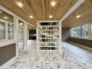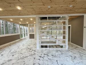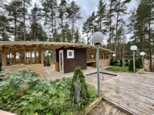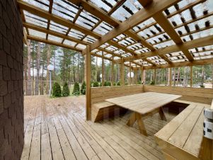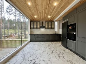 Большую часть 1 этажа занимает кухня-гостиная с панорамными окнами на три стороны света, с выходом на крытый балкон и открытую террасу. Здесь также находятся кабинет, гостевой санузел и хозяйственная кладовая/прачечная с входом прямо из кухни.На 2 этаже расположена большая мастер-спальня с видом на две стороны света с вместительной гардеробной и своей ванной комнатой, а также три детские спальни, каждая со своим личным гардеробом. Для этих спален предусмотрены общая ванная комната и дополнительный санузел, а в холле поместилась ещё небольшая хозкладовая.Прямо из холла второго этажа можно подняться по лестнице на эксплуатируемую кровлю. Здесь в окружении плодовых и декоративных растений на просторной открытой террасе могут располагаться кресла и шезлонги, детский бассейн, а под закрытым от дождя и ветра навесом летняя кухня с обеденным столом и местом для приготовления еды.Дом построен по технологии фахверк из клееного бруса. Для утепления используется теплоизоляционный материал PIR огнестойкий материал, обладающий самой низкой теплопроводностью среди всех известных теплоизоляционных материалов. Панорамное остекление выполнено двухкамерными стеклопакетами толщиной 46 мм с теплоудерживающим покрытием.В доме выполнена чистовая отделка. Проложены все инженерные сети, вентиляция, отопление, канализация; в комнатах оборудованы тёплые водяные полы с раздельной автоматической регулировкой температуры, дистанционным контролем и управлением (система "умный дом").Газовое отопление. На участке установлен индивидуальный газгольдер емкостью 7400 литров сжиженного газа.Эксплуатируемая кровля полностью готова: сделан выход на неё прямо из дома, прозрачный навес, встроенная мебель, посажены все растения, установлена система автополива.