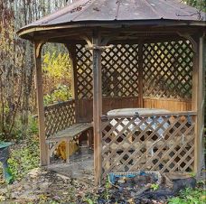 Построена красивая изящная деревянная беседка и на период строительства оставлена тёплая бытовка, в которой можно жить .