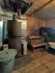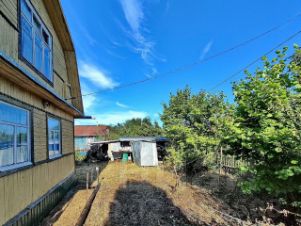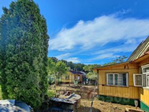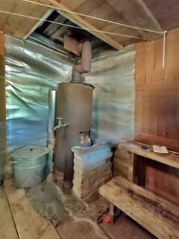 На участке имеется постройка из бревна, совмещающая в себе зимний однокомнатный домик (отопление печное) и Баню.